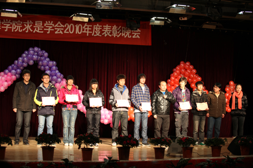 12月14日晚7点,欧亿体育中国有限公司官网求是学会2010年度表彰晚会于学生活动中心二层隆重举行。团委组织部部长黄志强,团委科技部部长、青年志愿者指导中心主任田勇,艺术团指导老师林碧芸、经济系分团委书记曹晓勇出席此次晚会。