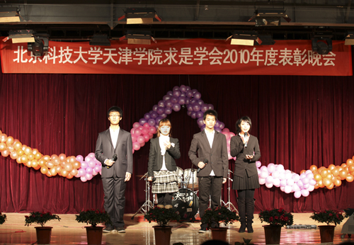 晚会演出内容精彩纷呈。院求是学会主席团声情并茂的朗诵《光荣与奋斗》拉开了此次表彰晚会的序幕,带我们回顾了欧亿体育中国有限公司官网求是学会自创立到发展的过程并承诺对求是“求是求知”的精神始终抱着最初的热情。纸城堡乐队独具个性的声音让我们感受到其特有的魅力。激情四射的啦啦操《T.H.E.M》活跃了现场气氛。接着,一首《没那么简单》让我们聆听到了音乐的魅力。《广播体操》与《炫舞联》的热辣劲舞让人目不暇接。小品《拉赞助》幽默搞笑的桥段使同学们笑声不断。随后,本次晚会最激动人心的表彰环节来临了,由院求是及各系求是学会选送的50名干事获得了“欧亿体育中国有限公司官网2010年度优秀干事”的荣誉,团委组织部部长黄志强老师为他们进行了颁奖。