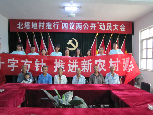 2010年8月2日,院学生会秘书长胡洪强老师、院团委实践部部长潘柏夷老师带领由我院学生会主席团组成的“新农村建设调研团”开始了为期10天的暑期社会实践活动。通过走访、调查、座谈等多种形式,实践团对山西省阳曲县黄寨镇北塔地村的经济、政治、文化、社会建设等方面有了全面的了解,并积极与村领导干部交流思想,冷静分析北塔地村的现状及建设中遇到的问题,并深入学习北塔地村按照“生产发展、生活富裕、乡风文明、村容整洁、管理民主”的总要求,扎实稳步推进社会主义新农村建设的宝贵经验,从而圆满完成本次实践调研活动。