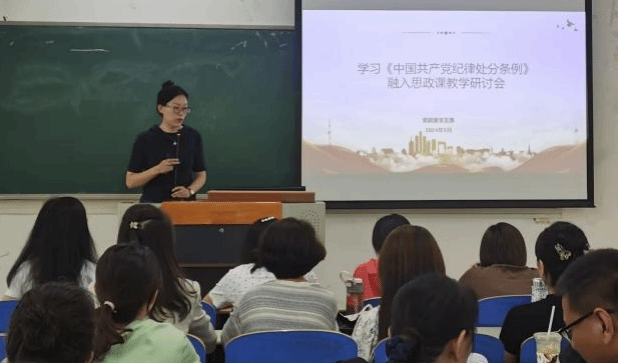5月22日下午,思政部组织教师在9教106教师开展学习《中国共产党纪律处分条例》融入思政课的教学研讨会。毛泽东思想和中国特色社会主义理论体系概论课程教研室主任冯海燕,马克思主义基本原理、中国近现代史纲要课程教研室主任杨金铃,思想道德与法治、形势与政策教研室主任陈霞做了主题交流发言,全体专职思政理论课教师参加了此次研讨会。