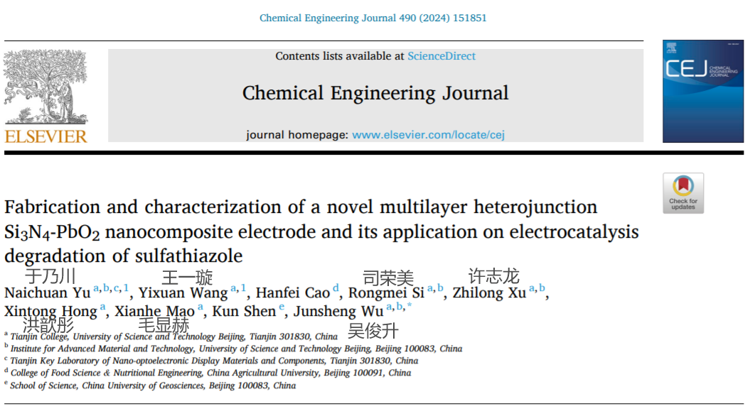 近日,我校材料与环境学院科研成果“Fabrication and characterization of a novel multilayer heterojunction Si3N4-PbO2 nanocomposite electrode and its application on electrocatalysis degradation of sulfathiazole(新型多层异质结结构Si3N4-PbO2电极的制备、表征及其电催化降解磺胺噻唑的应用)”在化工材料领域国际顶级期刊Chemical Engineering Journal(中科院一区期刊,影响因子15.1)上发表。材料系于乃川老师为论文第一作者,作者中还包括两名参与项目的本科生(洪歆彤、毛显赫)。该论文是在天津学院院长基金项目支持(项目编号No.2023YZJJ-KJ06)下产出的典型成果,也是我校首次以第一单位发表影响因子大于10.0的学术论文。