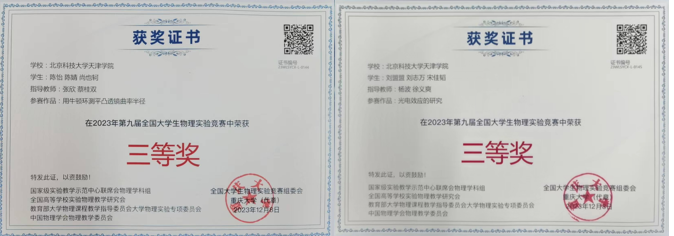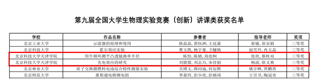 2023年12月8日,由国家级实验教学示范中心联席会物理学科组、全国高等学校实验物理教学研究会、教育部大学物理课程教学指导委员会大学物理实验专项委员会和中国物理学会物理教学委员会联合举办,重庆大学承办的2023年第九届全国大学生物理实验竞赛成功举行,我院两支代表队在比赛讲课类赛道中荣获佳绩,两支队伍均获得三等奖的好成绩。