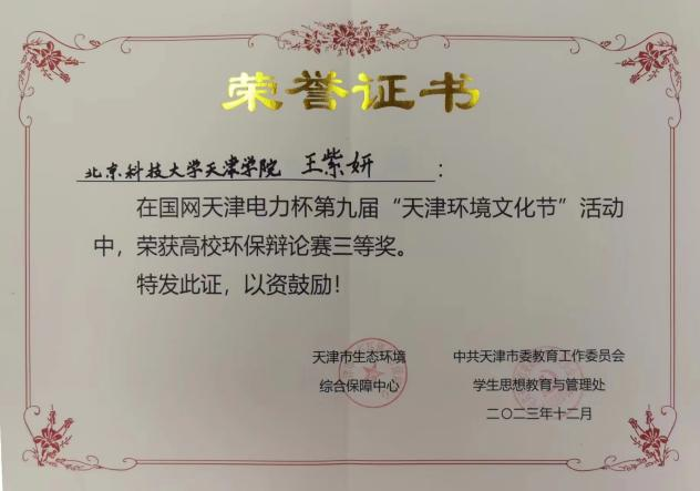 12月9日,由天津市生态环境局、天津市教育委员会及天津市文明办、津云新媒体集团、国网天津电力公司共同发起的国网天津电力杯高校环保辩论赛决赛暨第九届“天津环境文化节”闭幕式落下帷幕。由我院校团委副书记黄云汉老师指导的学院辩论队与来自全市的40所高校的大学生辩论队,经历初赛、复赛、半决赛及总决赛的激烈角逐,我院辩论队与南开大学、天津工业大学等高校荣获“国网天津电力杯”第九届天津文化节高校环保辩论赛三等奖。