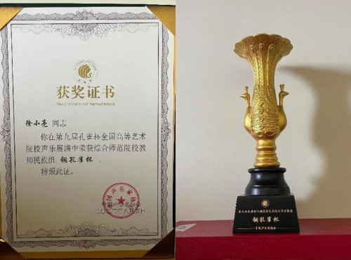 7月28日至8月5日,第九届孔雀杯全国高等艺术院校声乐展演在浙江音乐学院隆重举行,我院艺术学院音乐系声乐演唱教研室师生发挥出色,取得骄人成绩,总成绩位列前茅。此次参赛由音乐系声乐演唱教研室主任高丽与教师党支部书记任琦琦共同带队,共派出我院11名师生进入复赛,经过两轮展演、总展演的复赛激烈角逐,艺术学院音乐系青年教师徐小亮获得综合师范院校教师民族组铜孔雀奖,青年教师白晶袁获得综合师范院校教师美声组优秀奖,教师徐小亮指导的2021级学生荀子弋获得综合师范院校本科民族组优秀奖,其他师生获得共8项展演奖。艺术学院音乐系荣获第九届孔雀杯高等艺术院校声乐展演“优秀组织奖”。
