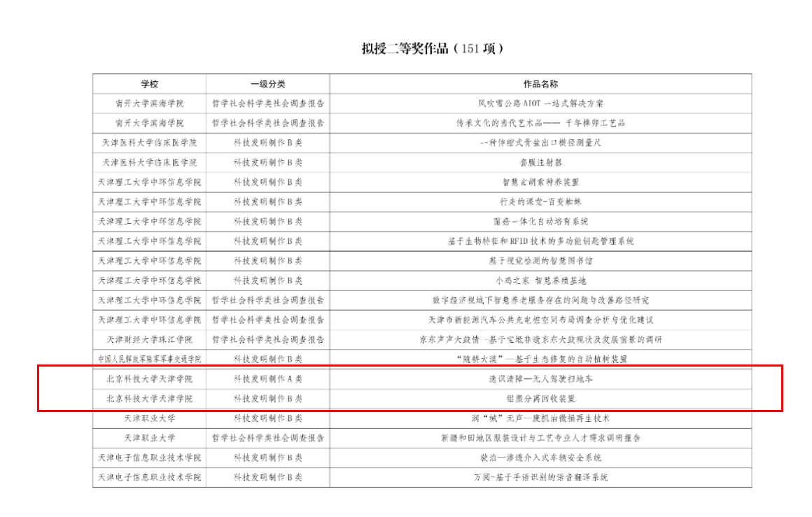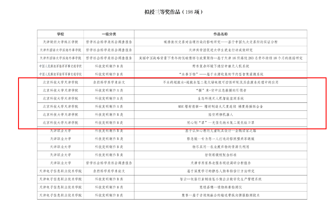 近日,由团市委、市教育两委、市科技局、市科协、天津社科院、市社科联、市学联主办的第十七届“挑战杯”中国银行天津市大学生课外学术科技作品竞赛圆满收官。本届“挑战杯”竞赛我校共十一个作品参赛,最终共有1项获得市级特等奖,2项获得市级二等奖,6项获得市级三等奖,获得历史最好成绩!
