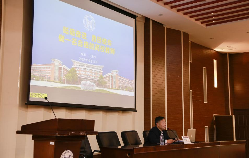 院长丁煦生为新入职教职工作了“砥砺奋进、勇担使命,做一名合格的高校教师”专题讲座。丁院长从学院基本情况、教育教学工作、师资队伍建设、教师发展四个方面做了全面介绍和深刻阐述。