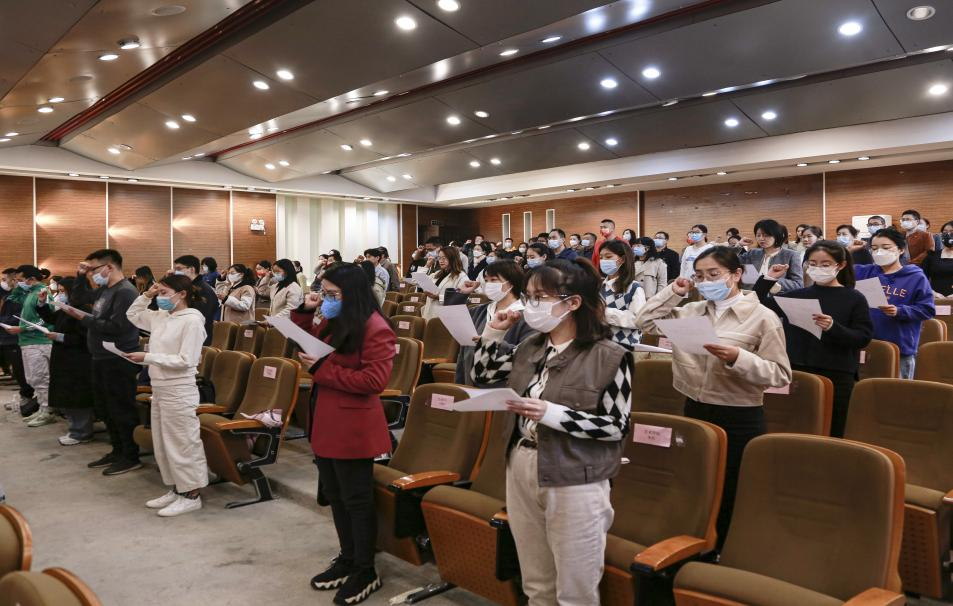 新入职教职工面向国旗进行了庄严宣誓,将“志愿成为一名人民教师,忠诚党的教育事业,遵守教育法律法规,履行教书育人职责,引领学生健康成长,做到有理想信念、有道德情操、有扎实学识、有仁爱之心,为教育发展、国家繁荣和民族振兴努力奋斗!”的誓言贯穿教书育人的全过程。