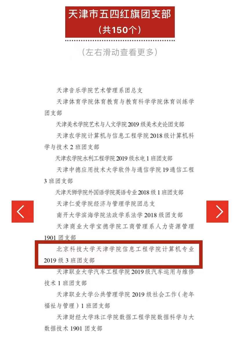 近日,天津“两红两优”光荣榜揭晓,旨在表彰先进,引导各级团组织和广大团员、团干部学习先进、奋发有为。我院管理学院分团委荣获“天津市五四红旗团委”称号,信息工程学院计算机1903班团支部荣获“天津市五四红旗团支部”称号,艺术学院视传1901班王诗宇、大健康学院护理1901班王蓉荣获“天津市优秀共青团员”称号。