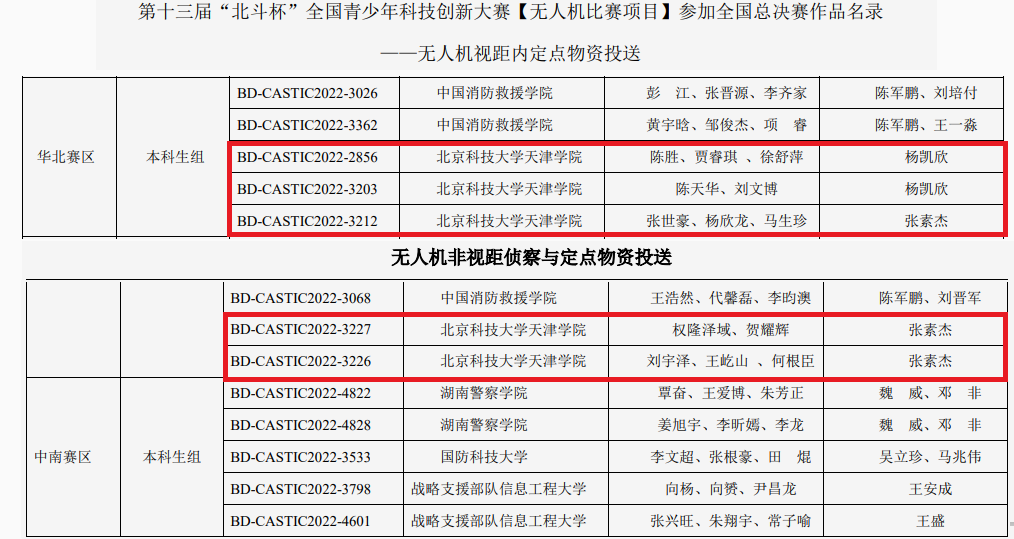 近日,由教育部科学技术司、共青团中央学校部、中国科协青少年科技中心、中国卫星导航系统管理办公室等相关部门共同主办的第十三届“北斗杯”全国青少年科技创新大赛华北赛区选拔赛落下帷幕,我院无人机系教师张素杰、杨凯欣指导的5支队伍晋级该赛事无人机赛项全国总决赛。