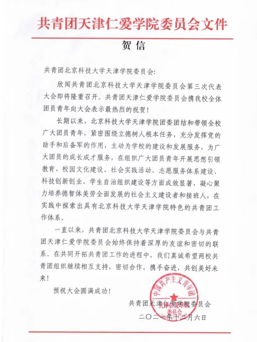本次大会收到了南开大学、天津师范大学、天津理工大学、天津财经大学、天津职业大学、天津仁爱学院、天津财经大学珠江学院、天津理工大学中环信息学院、天津传媒学院、天津医科大学临床医学院、天津商业大学宝德学院、天津外国语大学滨海外事学院贺信共计12封,我们将在今后的工作中继续加强交流与合作,共同为推动共青团和高等教育事业的发展作出贡献!