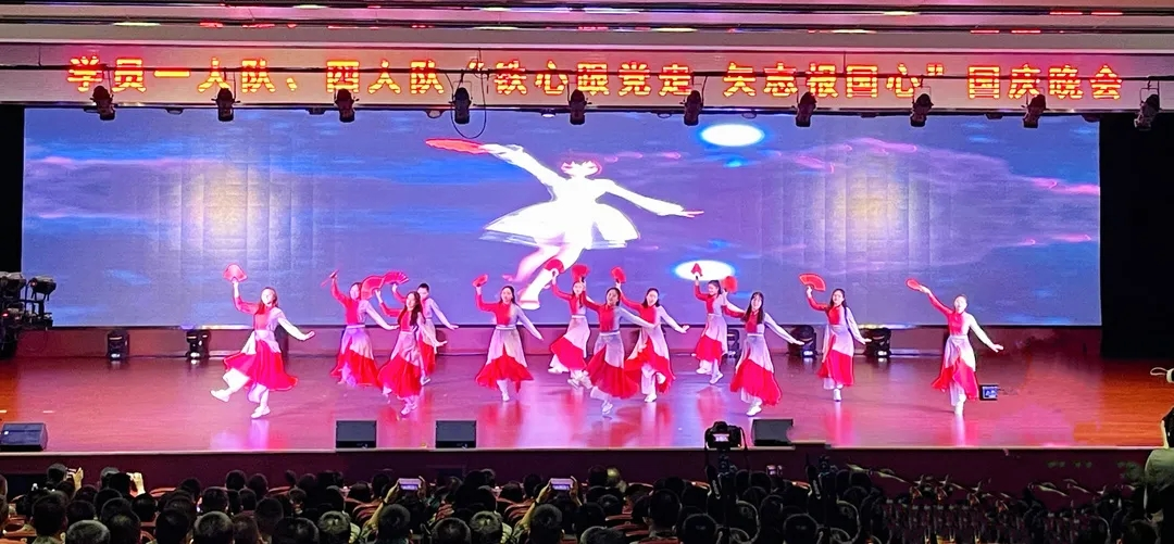 汇演中,我院学子充分展现青年大学生的文艺风采。身着红白相间的舞蹈服,手执红色扇子。为绿色军营中展示出一抹中国红。