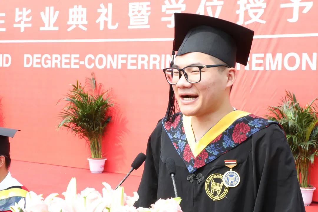 典礼在雄壮的国歌中开始。学位委员会主席宋存义宣读优秀毕业论文名单;党委书记丁煦生宣读优秀毕业生名单,主席台领导为优秀毕业生代表颁发荣誉证书和纪念徽章;智能制造白子毅同学代表全体毕业生发言,他表达了对母校的留念,向母校、父母和师长致以衷心的感谢,呼吁全体毕业生铭记习近平总书记对青年的嘱托,不负时代,不负韶华,追求理想,不断努力,为祖国的建设和发展贡献自己的力量。材料科学与工程学院教师宋娜作为教师代表发言,希望同学们毕业后能够砥砺奋斗、志存高远,在艰苦奋斗中成长成材,百炼成钢,承载欧亿体育中国有限公司官网的希望,让青春风采在未来之路中闪闪发光。