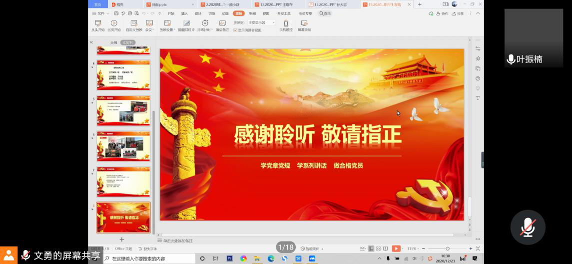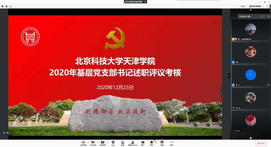 为进一步加强我院基层党支部建设,切实发挥党建工作的引领和保障作用,2020年12月23日下午,我院2020年度党支部书记述职评议会在腾讯会议召开。学院党委书记丁煦生,党委副书记叶振楠、牛犁,党委委员、党建办主任郭雅娟,各党总支书记、全体党支部书记参加了本次会议。