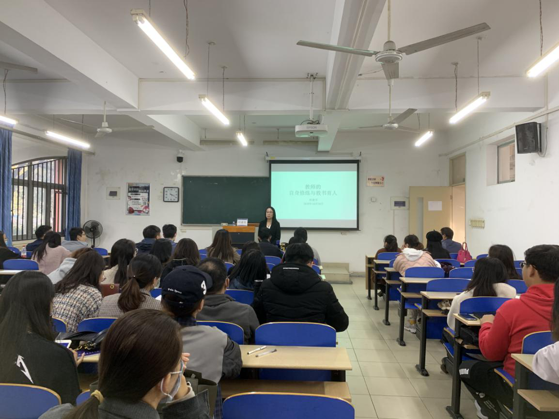 何建芬教授"全人教育"的教育观点传递给大家既重视社会价值,又重视人的价值的教育新理念、新追求。何建芬教授从人的可塑性、教师的角色与责任、全人教育讨论以及自信与自尊四个方面结合习近平总书记提出的“四有好老师”为基础,辅之自己三十多年的教学经验,将自己的心得分享给大家,在教学课堂上,要做到真正意义上的教师不是在教室中占据一定实体空间的外在教师,而是存在于学生心目中的内在神圣之师,一份自由的好奇心比威慑力更能推动学习者的学习,教师必须首先塑造自我,要“常讲常新、教学研究、提高交流、增强魅力”,把以身作则的榜样深深地刻画在学生的记忆里,才能让榜样的力量深入他们的心田。